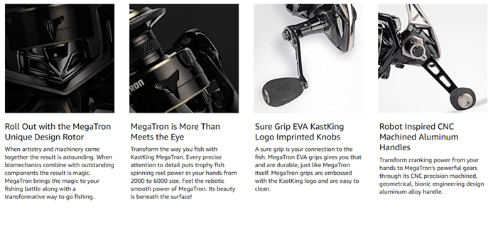 - MOST POWERFUL TRANSFORMER IN FISHING – KastKing MegaTron transforms the industry with the roll out of another great freshwater and saltwater fishing reel. The MegaTron spinning reel brings you a unique, geometrical, bionic engineering design. A spinning reel of this rugged build and unique optics deserves a special place in your fishing tackle arsenal. Its precise geometric forms offer a distinct autobot look that set it apart from all others and helps reduce weight while maintaining strength.