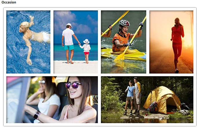 - 4. OCCASION - beach, swimming, pool, wake-boarding, sailing, boating, kayaking, windsurfing, cycling, jogging, walking, fishing, beach volleyball, gardening, lawn, car-washing and driving. Family outings!