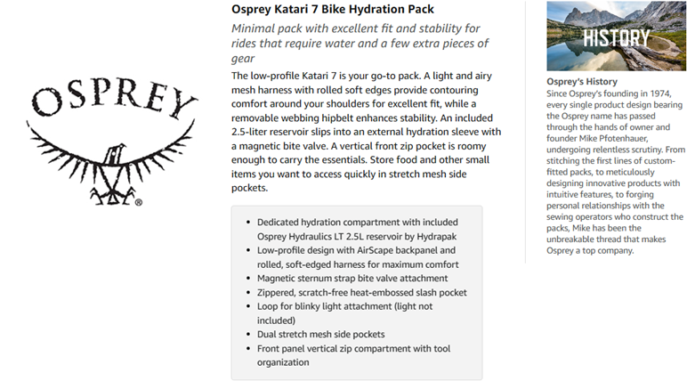 Want to hit the trail for a quick ride that calls for water and just a few minimal pieces of gear? The low-profile Katari 7 is your go-to pack. A light and airy mesh harness with rolled soft edges provide contouring comfort around your shoulders for excellent fit, while a removable webbing hipbelt enhances stability. An included 2.5-liter reservoir slips into an external hydration sleeve with a magnetic bite valve attaching to the sternum strap. A vertical front zip pocket is just roomy enough to carry the essentials, like a spare tube and tools or a rain jacket. Store food and other small items you want to access quickly in stretch mesh side pockets. Functional and versatile, no one is stopping you from using this pack for activities in the off season.