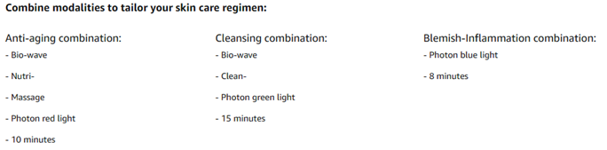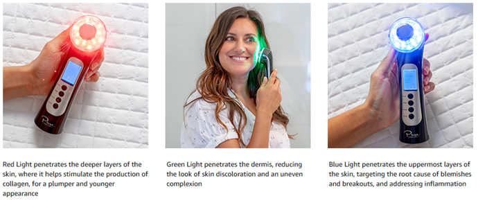 · LED Photonic Light Therapy: red, blue and green light modes, to address aging, blemish, and pigmentation concerns