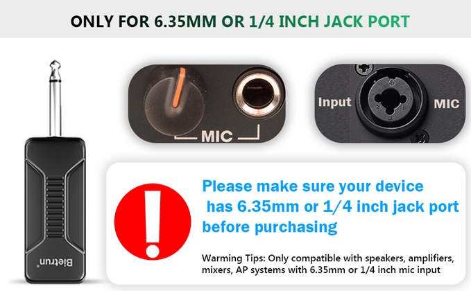 - Plug And Play, Easy To Use: ●Can Only Plug In equipment with Mic input, Can't Plug In AUX input, Otherwise No Sound.(Not Compatible with Bluetooth Speakers and Laptop)●For With Mic input Speaker, Singing Machine, Audio Amplifier, Pa System, Mixer, Voice Amplifier And More Streaming Multimedia Equipment..●The Display Can Show The Battery Power And Signal Strength In Real Time, Don'T Worry About Suddenly Not Working.