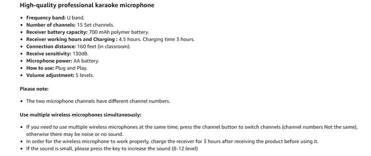 - Long Distance Wireless Karaoke Microphone: Wireless Distance Upgrade To 160 Feet (50m), Upgraded the microphone manufacturing process with Signal Stability●No Delay●No Radiation●Anti-Howling●Anti-Jamming ●Constant Frequency●Distortion <0.2%●15 Uhf Adjustable Channels. ●The Mic Outer Case Is Alloy Material Which Is Harder, Lighter And More Wear-Resistant.●We provide one year warranty.