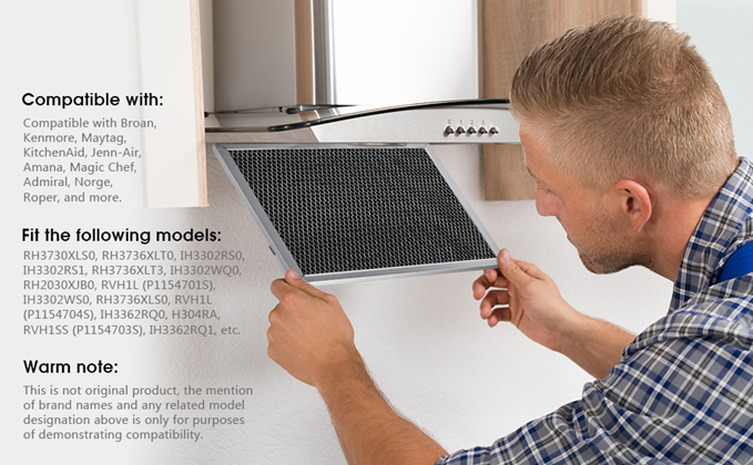 • Application: compatible with most top brands: Broan, Kenmore, Maytag, KitchenAid, Jenn-Air, Amana, Magic Chef, Admiral, Norge, Roper,and more; Fits this models: RH3730XLS0, RH3736XLT0, IH3302RS0, IH3302RS1, RH3736XLT3, IH3302WQ0, RH2030XJB0, RVH1L (P1154701S), IH3302WS0, RH3736XLS0, RVH1L (P1154704S), IH3362RQ0, H304RA, RVH1SS (P1154703S), IH3362RQ1,etc.