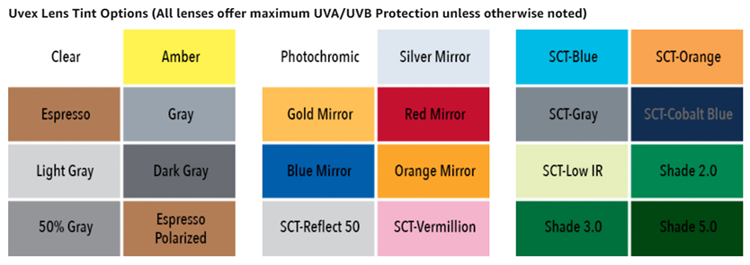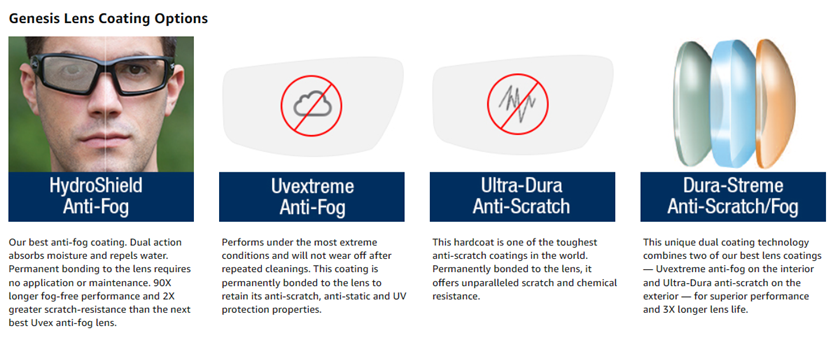 Uvex Genesis Safety Glasses are engineered for comfort, protection and style, Our Genesis line is the number one selling premium protective eyewear in the market, delivering an incredible range of superior product benefits. Built with MMT (Multi-Material Technology), these safety glasses offer the highest available impact safety: military V0 ballistic test protection against impact energies 7X higher than ANSI requirements (on select tints). They are also certified to meet CSA Z94.3 standards. Some models also feature an advanced TPE frame formulation that performs exceptionally well in environments where chemical mist, cutting oils and high moisture are present. The wraparound 9-base uni-lens offers excellent side coverage and peripheral vision, and the adjustable temple length & lens inclination makes for a truly customized fit. Unique comfort features include a soft elastomer browguard to diffuse impacts, and soft, flexible nose fingers that reduce slippage and conform to almost any nasal profile. A ventilation channel between the frame and lens vents the eye socket area to deliver an outstanding level of moisture and fog control. Genesis safety eyewear also boasts an easy and economical lens replacement system to extend the life of your glasses. Uvex Genesis Safety Glasses are available with multiple lens tints to suit almost any work environment. Uvex stands for "Ultra Violet Excluded", which means our safety glasses employ specifically formulated resins that filter 99.9% of the UV radiation in accordance to the U6 scale of the Z87 standard. Uvex has also developed Spectrum Control Technology (SCT), which incorporates unique dyes designed to absorb select wavelengths of radiant energy (light). Our anti-glare glasses, tinted safety glasses and safety sunglasses are designed to manipulate light to reduce a spectral hazard, or to provide distinctive filtration for specific safety eyewear viewing tasks. Examples include filtering solar radiation to reduce glare, and blocking radiation from welding to protect workers around these operations. Multiple anti-fog and anti-scratch coatings are also available. The new HydroShield technology provides our best anti-fog lens coating, keeping your vision clear up to 90X longer than most other competitive anti-fog safety glasses. The Uvextreme anti-fog coating offers great, dual-action performance under demanding hot and humid conditions for long lasting fog-free performance. Our Ultra-Dura hardcoat makes for some of the toughest scratch-resistant safety glasses in the world. Permanently bonded to the lens, it offers unparalleled scratch and chemical resistance. The dual anti-fog/anti-scratch Dura-Streme coating combines the benefits of our industry-leading Uvextreme anti-fog coating and our Ultra-Dura anti-scratch hardcoat. While the advanced anti-fog properties of Uvextreme help keep the interior of the lens clear from fogging, the rugged properties of Ultra-Dura protect the exterior of the lens from scuffs and scratches, adding up to three times more life to lenses.