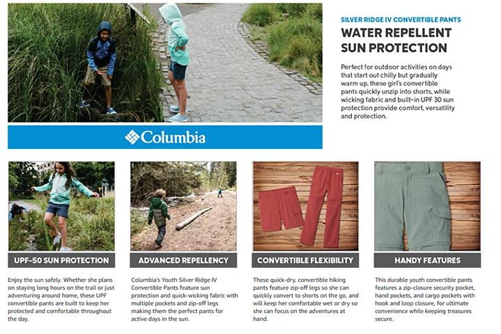 Specially crafted for active youth, the Columbia Girl’s Silver Ridge IV Convertible Pants are the ultimate outdoor staple. Crafted of 100% ripstop nylon, these pants remain lightweight, comfortable, and durable, no matter the weather or activity. High quality materials, expert craftsmanship, and stitching are the backbone of Columbia’s apparel. Advanced technology and functional design make for a great experience. Whether she’s out for hours of wading, hiking, or just yucking it up with her friends, this pant/short combo will not disappoint. Our protective Omni-SHADE technology features UPF 50 to help block and shield from UVA and UVB sun rays, while our Omni-WICK material wicks away moisture and perspiration for dry and comfortable wear all day long. Durable, comfortable, and versatile - with two quick zips - she'll be ready to go from pants – to wading in shorts instantly. Columbia offers our girl’s youth outdoor convertible pants in multiple colors and sizes. Regular Fit. To ensure the size you choose is just right, please refer to our sizing chart. To find your waist measurement, measure around your natural waistline. And for your inseam measurement, measure from the top of the interior leg to the bottom of the ankle.