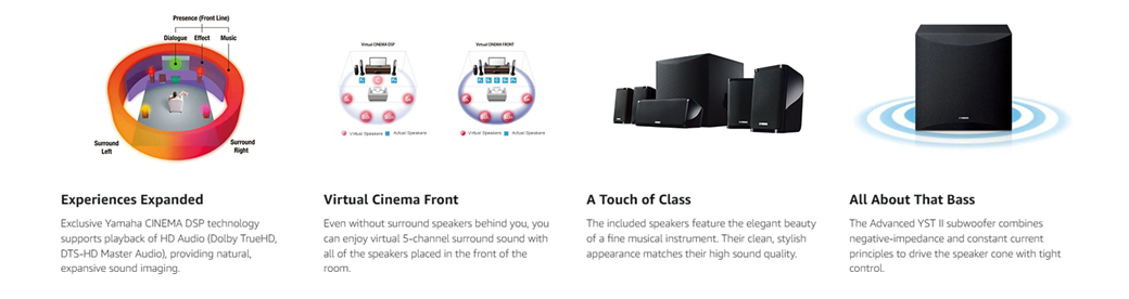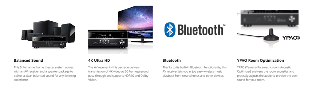 Providing complete compatibility with the latest HDMI standards, the AV receiver in this package delivers transmission of 4K video at 60 frames/second pass-through. It also supports HDR (High Dynamic Range) Video including Dolby Vision and Hybrid Log-Gamma which provides incredible contrast, smooth tone and rich, bright colors giving you full, high-definition enjoyment with an exceptionally realistic and natural picture quality.