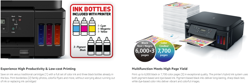 - With an impressive high page yield, print up to 6,000 Black text pages or 7,700 Color pages per each full ink bottle set.(2)The PIXMA G6020 MegaTank All-In-One Printer uses both pigment-based and dye-based ink. The pigment-based black ink formulation allows for long lasting and sharp black text. The dye-based ink formulation allows for vibrant and colorful images.