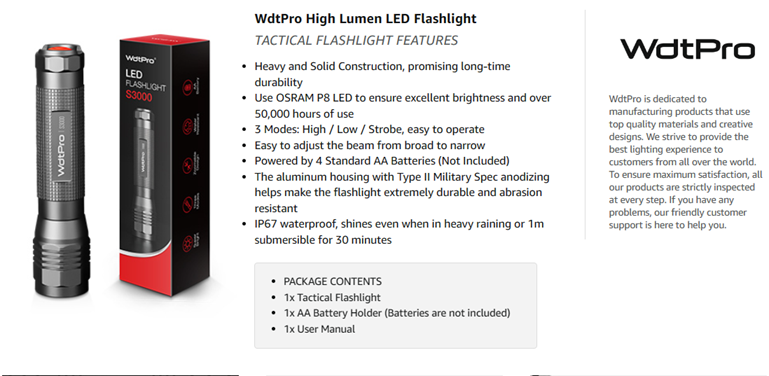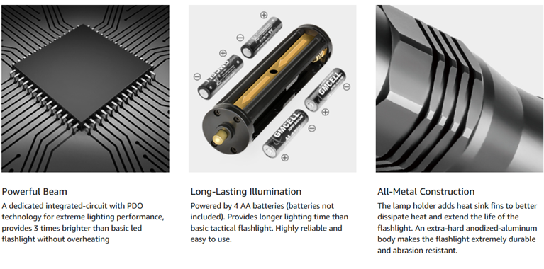 - 【BRIGHTEST FLASHLIGHT】 With high power OSRAM P8 LED, the S3000 provides up to 1600 real lumens(Max) but only need 4 * AA batteries (battery not included). This mid-size flashlight is high on power but still compact enough to fit in your hands, backpack, survival kit, or glove compartment.