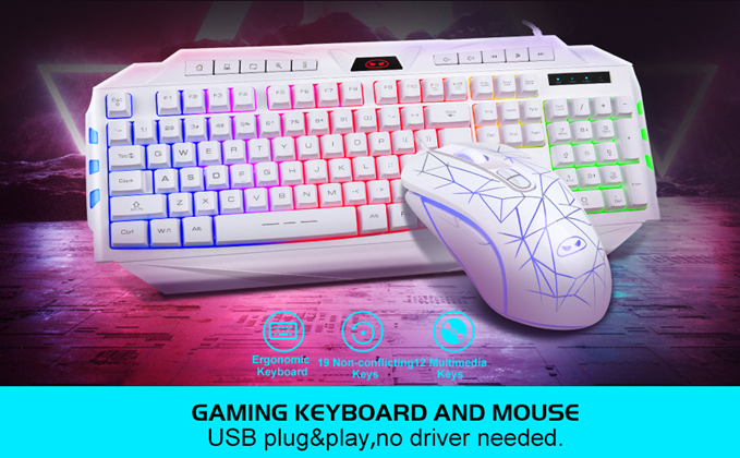 RAINBOW BACKLIT-Rainbow backlit gaming keyboard&mouse, seven colors breathing backlit mouse. Ergonomic design for wired keyboard and mouse, comfortable to operate.
