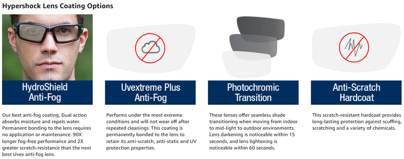 • PERMANENT LENS COATINGS: Uvex lens coatings deliver long-lasting anti-fog & anti-scratch performance; permanent bonding to the lens prevents wash/wear off even after extended use or repeated cleanings