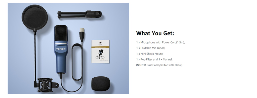 • What You Get: 1 x Microphone with Power Cord(1.5m), 1 x Foldable Mic Tripod, 1 x Mini Shock Mount, 1 x Pop Filter and 1 x Manual. (Note: It is not compatible with Xbox.)