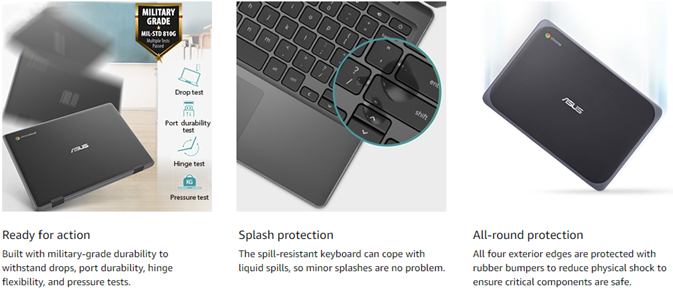 ASUS Chromebook C203XA is built with military-grade standards, as well as a rubber bumper, and a spill-resistant keyboard that withstands knocks bumps drops, and spills. This compact 11.6-inch Chromebook gives you day-long battery life. With the immense variety of apps on the Google Play Store, ASUS Chromebook C203XA is the perfect companion for study and play.