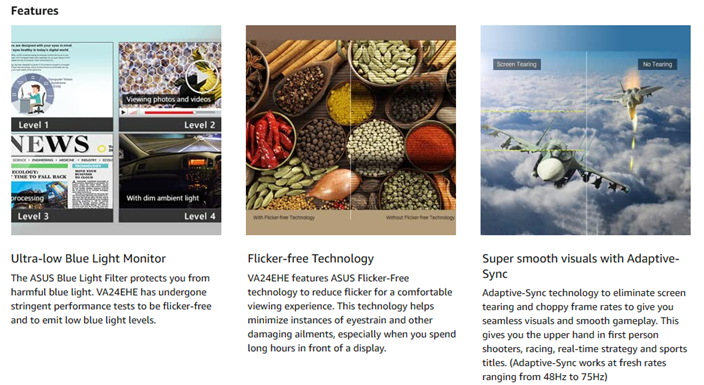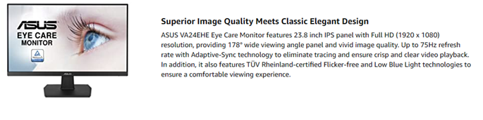 The 23. 8” Full HD VA24EHE monitor is elegantly designed to complement any desk. Va24ehe’s gorgeous 178° wide viewing angle display is great for sharing. It includes input connectivity for HDMI, VGA, DVI-D and the adjustable tilt design allows for freedom in movement up to -5°+23°.