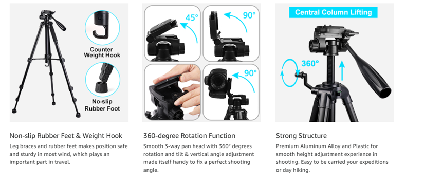 - 【Support All Shooting Angles】Thanks to its versatile pan head, It adjusts to multiple shooting angles in seconds, including landscape mode, portrait mode, low-angle shots, high-angle shots and 360 ̊ Panoramic Shot. Anyone can learn to be on camera and experience the fun of shooting.