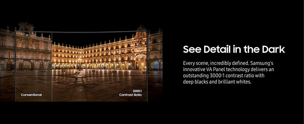 - SEE DETAIL IN THE DARK: Every scene, incredibly defined; Samsung's innovative VA Panel technology delivers an outstanding 3000:1 contrast ratio with deep blacks and brilliant whites
