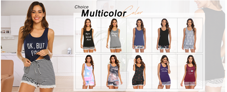 • FEATURES: Pajamas for women featuring sleeveless tank top and classic striped shorts, scoop neck, cute printed and lace trim hem.