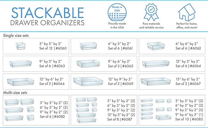 Time to get your drawers organized! With many applications and configurations, these individual organizers can fit side by side to sort daily essentials in your drawers! Each container easily stacks for multiple layers of storage. Great for deep drawers! Purchase additional sizes to customize your organizational needs. Create modular sets to organize drawers in your entire house. Clear, break-resistant plastic fits in any décor. No assembly required. Cleans easily with mild soap and warm water. Made in USA.