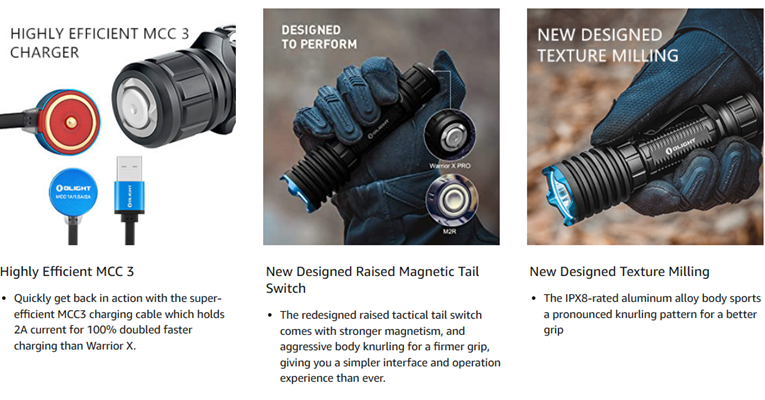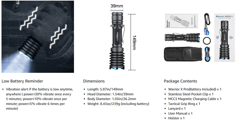 Included Components | Warrior X Pro(Battery Included) x 1, MCC3 Magnetic Charging Cable x 1, Stainless Steel Pocket Clip x 1, Lanyard x 1, Tactical Grip Ring x 1 |