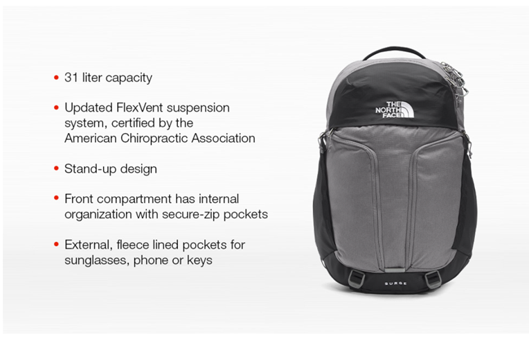 • SURGE CLASSIC. With a 31-liter volume, the Surge backpack has more than enough room to accommodate your daily office carry. It also has a sleek, tech-inspired design and a coveted endorsement from the American Chiropractic Association.