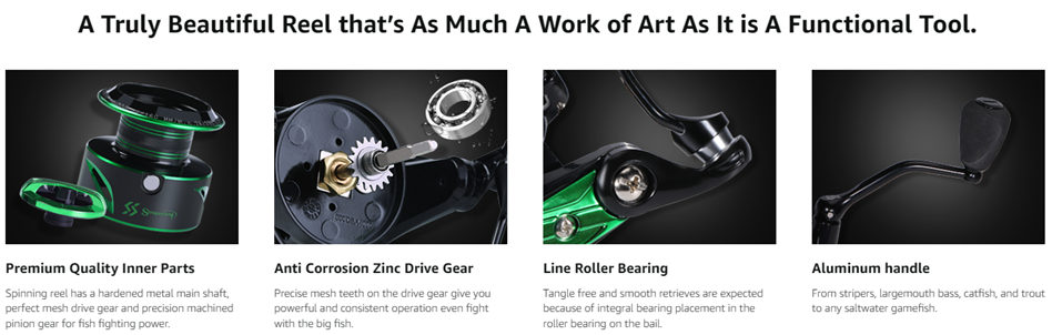 • Spinning Fishing Reel With CNC Machine Cut Handle, Left / Right Interchangeable, 12+1 Corrosion Resistant Smooth Ball Bearing.