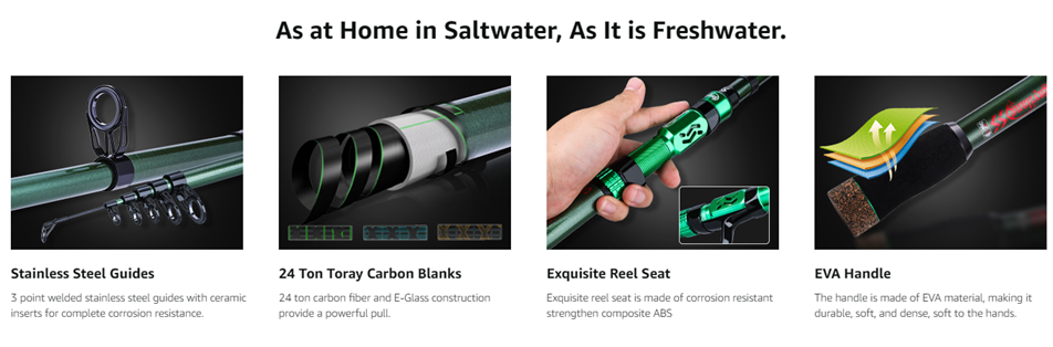 • The Exquisite Fishing Reel Seat Is Made of Corrosion Resistant CNC Machined Aluminum for a solid base and all-day; EVA handles are comfortable, durable and exceptionally slip resistant giving you maximum control over your fishing rod inall conditions.
