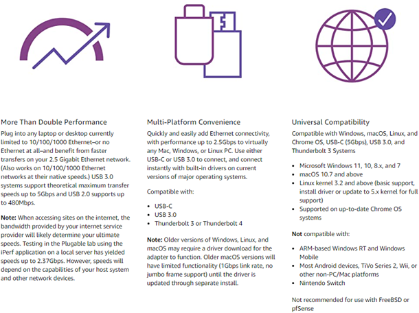 Drivers built into Windows 11, 10, 8.x, and 7 as well as macOS 10.7 and above (driver install required for 2.5Gbps link rate and jumbo frames), and Linux kernel 3.2 and above.