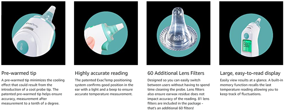 When checking for a fever at home, you want accurate and reliable results, quickly. The Braun ThermoScan 6 (IRT6515) delivers. It’s an easy to use ear thermometer with an easy to read digital display and color coded temperature readings. Unlike other ear thermometers, where the cool tip of the thermometer in the ear may result in lower temperatures, this digital thermometer features a pre-warmed tip that ensures accurate temperature readings. It also features infrared technology that takes a temperature in seconds, and is gentle, so it’s a great choice for the entire family. Use it as a digital baby ear thermometer, for toddlers and kids and even as an adult thermometer. The disposable lens filters keep sharing sanitary. *Based on Ardent Consulting Survey reporting that of the surveyed pediatricians who recommend a brand of thermometers to their patients, Braun is the most recommended brand, and of the surveyed pediatricians that use a branded thermometer, Braun is the most frequently used brand.