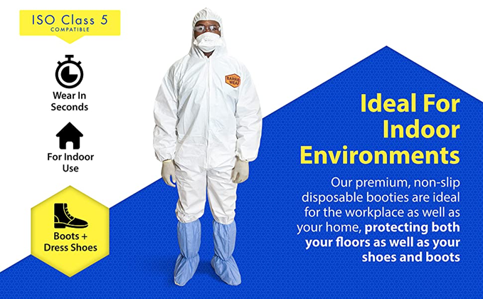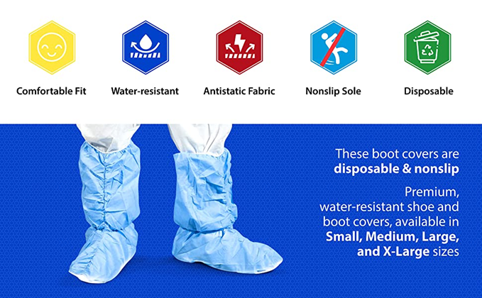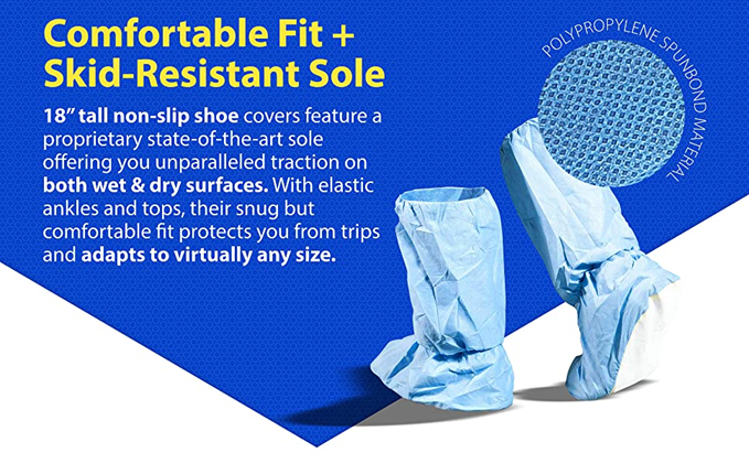 • Durable shoe coverings are extra thick and feature a proprietary state-of-the-art skid resistant sole, offering your feet unparalleled protection from slips, falls and trips on dry and wet surfaces