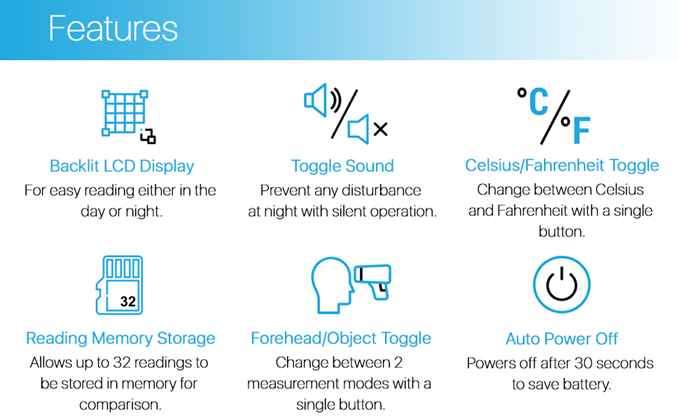 • Feature Rich: Easy to use features include a 30 second auto power off function to save power, memory storage function to save up to 32 measurements for quick access, a switch between measuring object or body temperatures, a sound toggle and a fever alert system.