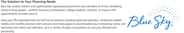 Need plenty of room for planning your day, week, month and year? This stylish weekly and monthly planner will keep you organized everywhere you go. Simple page designs add a touch of elegance and offer plenty of room for all of your important information. Monthly calendar tabs allow for easy access to each monthâ s plans while weekly views offer ample writing space for detailing each day. Stay on track throughout the year with this beautiful planner dated January 2021 - December 2021. High quality white paper provides clean writing space for jotting down your appointments, to-dos and reminders. Durable coated tabbed dividers are long lasting and make accessing information a breeze. Use this dated planner to stay on track for appointments, and to jot down notes and ideas in one place. Premium quality covers and twin-wire binding. Mix and match with other Lindley Collection planning products from Blue Sky to organize your daily life. Blue Sky creates modern and sophisticated organizational planners and calendars to fit the scheduling needs of busy people - whether business professionals, college students, teachers, or anyone with appointments to make note of. Keep your life organized with our full line of products including desk pad calendars, wirebound tabbed weekly and monthly planners with contacts and notes pages to accommodate your scheduling needs, and laminated two-sided wall calendars, all in a variety of colors and patterns to suit your lifestyle and personality.