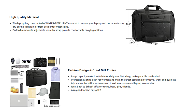 - Fits up to 18 inches laptop: Huge roomy and two main compartments designed for keeping your laptop and all your small accessories, such as mouse, keys, credit cards, mobile phone, etc.