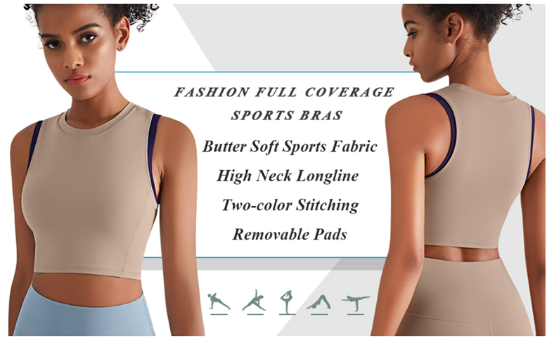 - High Neckline Cropped Tank: With wide straps and built in shelf bra,this long line sports bra two-tone yoga crop top provide you with high coverage to hold your "girls" in, but also offer you great support to keep your bras staying in place better. A full range of motion always let you twist with ease during exercising.