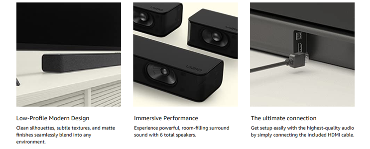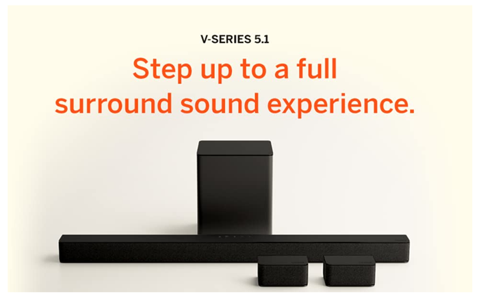Hear what you’ve been missing with the newly designed VIZIO V-Series™ 5.1 Home Theater Sound Bar. The V-Series 5.1 offers immersive home theater surround sound, a sophisticated new look and HDMI connectivity for the highest-quality audio. Three full-range speakers--including a dedicated center speaker for crystal-clear dialogue--are all perfectly balanced within the slim sound bar. Also included are a pair of low-profile surround speakers to envelop the listener, and a wireless 5” subwoofer that brings booming bass. 4K HDR content is enhanced with Dolby Audio™ 5.1 for the highest-fidelity sound, and DTS® Virtual:X™ sound enhancement adds room-filling, floor-to-ceiling virtualized 3D sound to movies and music. Optional surround modes provide the versatility to play stereo music through the sound bar and surround speakers simultaneously, transforming any content into powerful 5.1 audio; or place the surround speakers up front, next to the sound bar, for more expansive virtual surround in smaller spaces. Voice Assistant Input gives you the convenience of a voice assistant you’re already accustomed to (sold separately) and lets you operate it right through the sound bar for an upgraded audio experience. You can also wirelessly connect your compatible phone for high-quality Bluetooth music streaming. Now with an elegant new backlit LCD display remote control, the VIZIO V-Series 5.1 Home Theater Sound Bar can help turn your living room into a captivating home theater.100-word description: French.