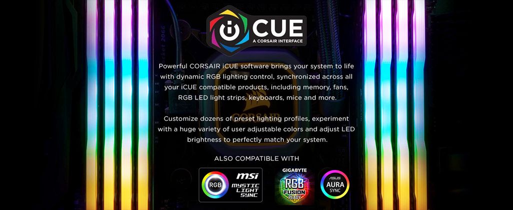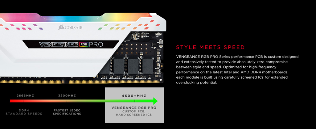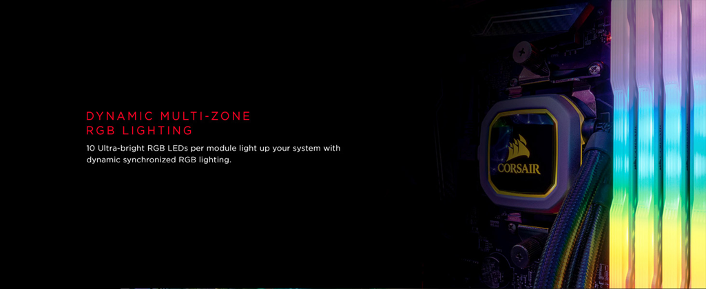 CORSAIR VENGEANCE RGB PRO Series DDR4 memory lights up your PC with mesmerizing dynamic multi-zone RGB lighting, while delivering the best in DDR4 performance and stability. Every module boasts ten individually controlled RGB LEDs, while wire-free design makes installation simple. Take control with CORSAIR iCUE software and completely customize every module’s lighting to match your system, or easily synchronize lighting across all your CORSAIR products with Light LINK. A custom designed PCB provides the highest signal quality for the best level of performance and stability on the latest AMD and Intel DDR4 motherboards, while specially screened ICs unlock superior overclocking.