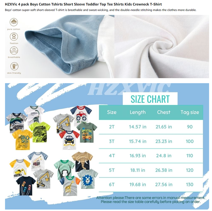 ?Cute patterns:Short-sleeved T-shirt sets of printed series with rich themes, cartoon 3D patterns of dinosaurs,cars,excavators,animals,etc.Cool and novel design will definitely make your boys exclaim and don't want to take them off.