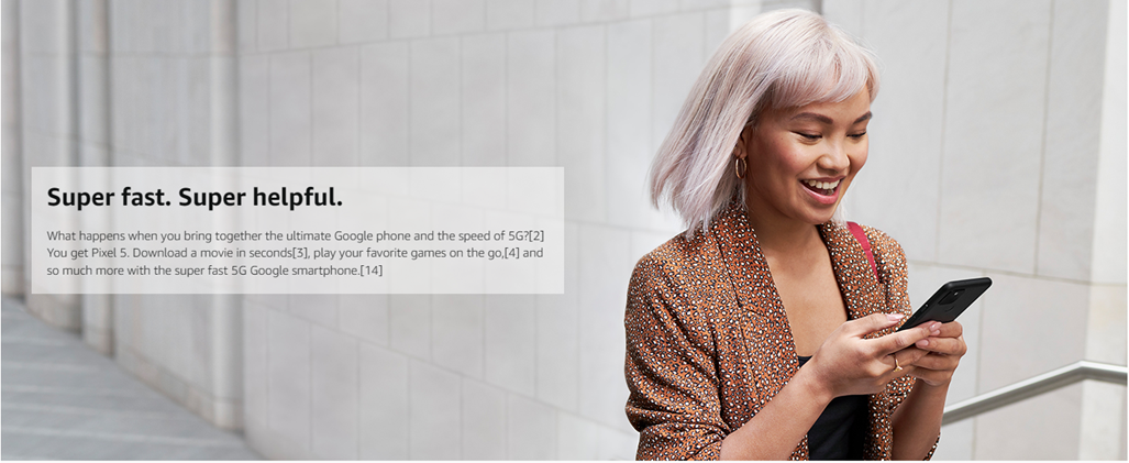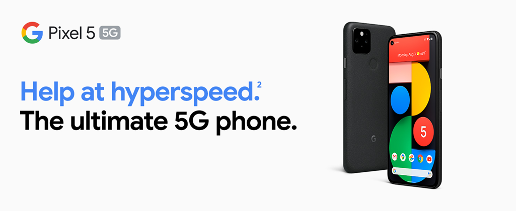 Meet Pixel 5, the ultimate Google phone with the speed of 5G.[2] It has the helpful stuff you need in a phone, with an extra boost of 5G speed. So you can download a movie in seconds,[3] take stunning ultrawide photos in any light, and keep going with an all-day battery that can last up to 48 hours with Extreme Battery Saver.[8] Pixel 5 also charges wirelessly,[6] keeps your data safe, blocks robocalls,[11] and is water-resistant.[10] It’s the super helpful 5G Google cell phone at a helpful price. And it’s an unlocked smartphone, so you can choose the data plan and carrier that work for you.[1][1] Works with all major carriers. Contact carrier for details. 5G service is carrier dependent.[2] Requires a 5G data plan (sold separately). 5G service and roaming not available on all carrier networks or in all areas. Contact carrier for details about current 5G network performance, compatibility, and availability. Phone connects to 5G networks, but 5G service, speed, and performance depend on many factors including, but not limited to, carrier network capabilities, device configuration and capabilities, network traffic, location, signal strength, and signal obstruction. Actual results may vary. Some features not available in all areas. Data rates may apply.[3] Download speed claims based on testing videos from three streaming platforms. Average download time was less than sixty seconds. File sizes varied between 449MB and 1.3GB. Download speed depends upon many factors, such as file size, content provider and network connection. Testing conducted in an internal 5G network lab and on pre-production hardware in California in July/August 2020. Actual download speeds may be slower.[4] Enabling gameplay with cellular data may increase your mobile data usage up to 2.7GB/hr. Gameplay is service-, network-, connection-, and game-dependent, and may not be available for all games in all areas. Users may experience inconsistent gameplay. Stadia requires account creation.[5] Hotspot capability subject to carrier plan.[6] Qi-compatible. Wireless charger sold separately.[7] Designed to charge Qi-certified devices. Use of Battery Share significantly reduces Pixel battery life. Cases may interfere with charging and will reduce charging speed. Charge speeds may vary.[8] For “All day”: Maximum battery life based on testing using a mix of talk, data, standby, and use of other features. Testing conducted on two major carrier networks using Sub-6 GHz non-standalone 5G (ENDC) connectivity. For “Up to 48 hours”: Maximum battery life based on testing using a mix of talk, data, standby, and use of limited other features that are default in Extreme Battery Saver mode (which disables various features including 5G connectivity). Testing conducted on two major carrier networks. For both claims: Pixel 4a (5G) and Pixel 5 battery testing conducted by a third party in California in mid 2020 on pre-production hardware and software using default settings, except that, for the “up to 48 hour claim” only, Extreme Battery Saver mode was enabled. Battery life depends upon many factors and usage of certain features will decrease battery life. Actual battery life may be lower.[9] Android version updates for at least 3 years from when the device first became available on the Google Store in the US.[10] Pixel 5 has a dust and water protection rating of IP68 under IEC standard 60529. Charger and accessories are not water or dust resistant. Water and dust resistance are not permanent conditions and may be compromised due to normal wear and tear, repair, disassembly or damage.[11] US only. English only. Call Screen may not detect all spam calls.[12] Screen sharing not available on group calls. Requires Wi-Fi or 5G internet connection. Not available on all apps and content. Data rates may apply. 5G service, speed and performance depend on many factors including, but not limited to, carrier network capabilities, device configuration and capabilities, network traffic, location, signal strength, and signal obstruction.[13] Some third-party apps and data may not be transferred automatically.[14] Subscriptions may be required. [15] Not available for all apps and content. Display automatically adjusts to optimize for best viewing and battery performance.[16] Storage specifications refer to capacity before formatting. Actual formatted capacity will be less.[17] Maximum battery life based on testing using a mix of talk, data, standby, and use of other features. Battery life depends upon many factors and usage of certain features will decrease battery life. Pixel 4a (5G) and Pixel 5 battery testing conducted by a third party in California in mid 2020 on pre-production hardware and software, using default settings. Testing conducted on two major carrier networks using Sub-6 GHz non-standalone 5G (ENDC) connectivity. Actual battery life may be lower.[18] Qualcomm Snapdragon is a product of Qualcomm Technologies, Inc. and/or its subsidiaries. Qualcomm and Snapdragon are trademarks of Qualcomm Incorporated, registered in the United States and other countries.[19] Back housing only.[20] Up to 18W wired charging rates are based upon use of the included charger plugged into a wall outlet. Actual results may be slower.[21] Charging rates are based upon use of the included charger plugged into a wall outlet. Actual results may vary.