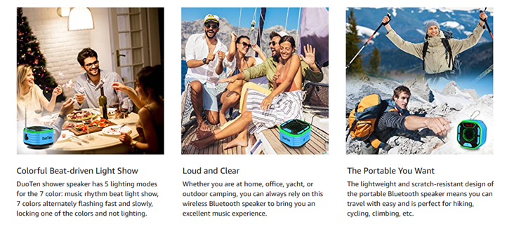 - 7 COLORS COOL RHYTHM LIGHT SHOW-The Bluetooth speakers with 7 color LED special lights can give your party an exciting atmosphere, leading you become the focus of the audience. Freely customize the light show you want, suitable for home, party, pool, beach even go camping at night. Is one of the best choices to bring romance to your life.