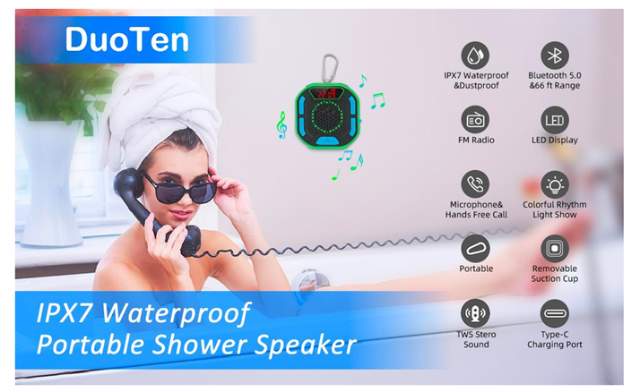 - MULTIFUNCTIONAL LED DISPLAY-The shower speaker’s LED display allows you to check time, mode, battery, volume, and the LED display design help to identify the keys in different position. In FM radio mode, the shower radio supports to change the station within frequency range and enhance the signal via antenna, bring you a more convenient and comfortable life.