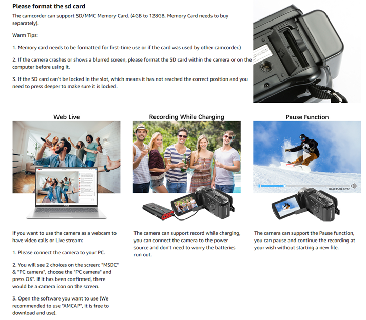 5. How to record videos: Press the "Mode" button to change to the "Video" mode. Press the "START/STOP" button to start the recording. You can press the "Photo" button to pause the recording. And press the "START/STOP" button to finish the recording.
