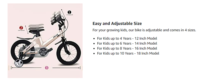 • ADJUSTABLE: Kids grow fast, so we have the perfect bike that will allow you to adjust both the handlebars and seat heights to fit your kids’ needs. For this 14 inch bike, the handlebars can be adjusted from 23-26 inches, and seat height can be adjusted from 19-23 inches. All bikes come with a page of fun stickers so they can customize their new bike.