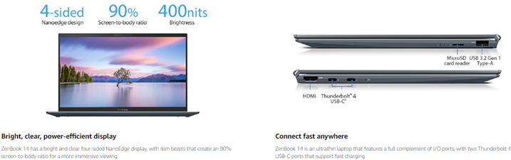 - Extensive connectivity with HDMI 2.0b, USB 3.2 Type-A, Thunderbolt 4 via USB Type-C, Wi-Fi 6 (802.11ax), Bluetooth 5.0, and Micro SD card reader (USB Transfer speed may vary. Learn more at ASUS website)