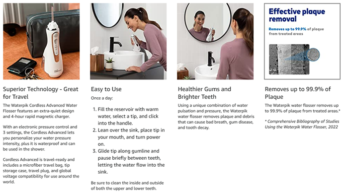• EASY AND EFFECTIVE: The Waterpik Cordless Advanced water flosser removes up to 99.9 percent of plaque and is up to 50 percent more effective than dental floss for improving gum health. Just fill the reservoir with warm water, place the tip in your mouth, and start flossing.