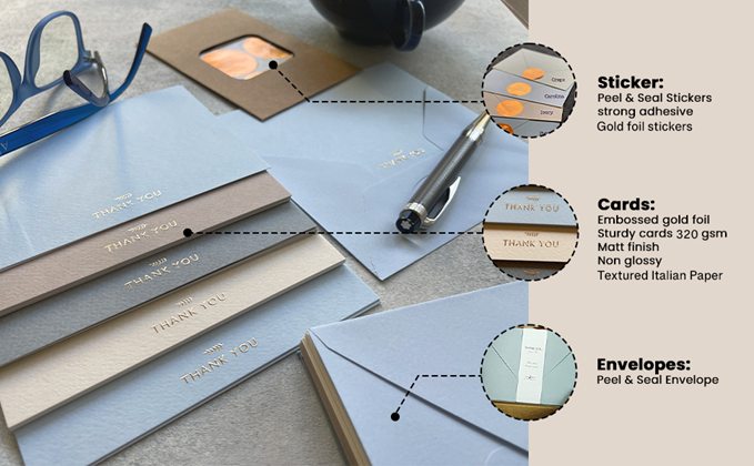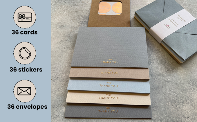 • HIGH QUALITY MATERIAL - Solid and high end finish with 320 GSM Italian thick textured paper card embossed gold foil pressed. Non-glossy paper, means no fingerprints or scratches when handling these thank-you cards. Will not smudge or smear.