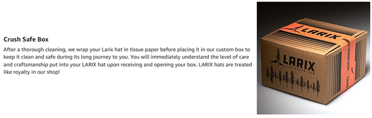 - SHIPPED IN BOX : After your hat has been cleaned and prepped we wrap your Larix hat in tissue paper before placing it in our custom box to keep it clean and safe during its long journey to you. IF YOUR HAT DOESN'T ARRIVE IN A BOX PLEASE REACH OUT TO US DIRECTLY TO LET US KNOW. You will immediately understand the level of care and craftsmanship put into your Larix hat upon receiving and opening your box.