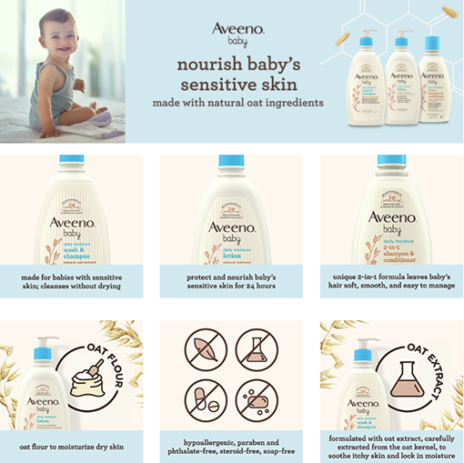 Aveeno Baby Daily Moisture Body Lotion with natural colloidal oatmeal features a nourishing, non-greasy formula that helps protect your little one's delicate skin and moisturizes for a full 24 hours. This nourishing baby moisturizing lotion is specially formulated to be gentle enough for babies. Natural colloidal oatmeal blended with dimethicone skin protectant allows this oatmeal baby body lotion to moisturize for a full 24 hours and helps prevent and temporarily protect chafed, chapped, or cracked skin. From a pediatrician-recommended brand, this hypoallergenic baby lotion can be used every day to keep your baby's skin soft, smooth, and healthy-looking. From Aveeno, a pediatrician and dermatologist-recommended brand, the non-greasy lotion formula is free from fragrance, parabens, steroids, phenoxyethanol and phthalates, so it won't irritate baby's sensitive skin.