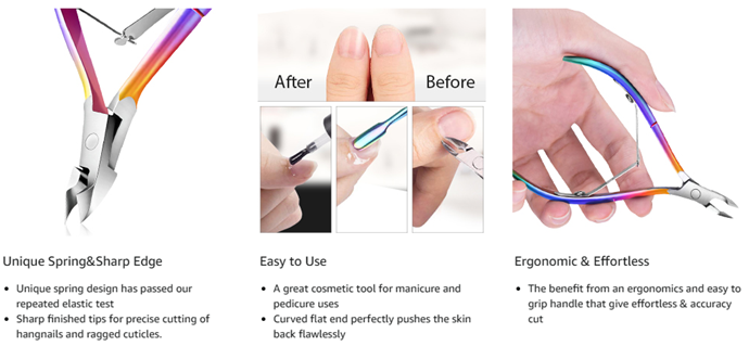 • ? Perfect Jaw Design And Dual End Cuticle Pusher: The nail nipper could easily scraper the cuticle or nail gels, even in small areas around nails. The spoon-shaped and triangle designed cuticle pusher could remove residues without pulling or tugging.