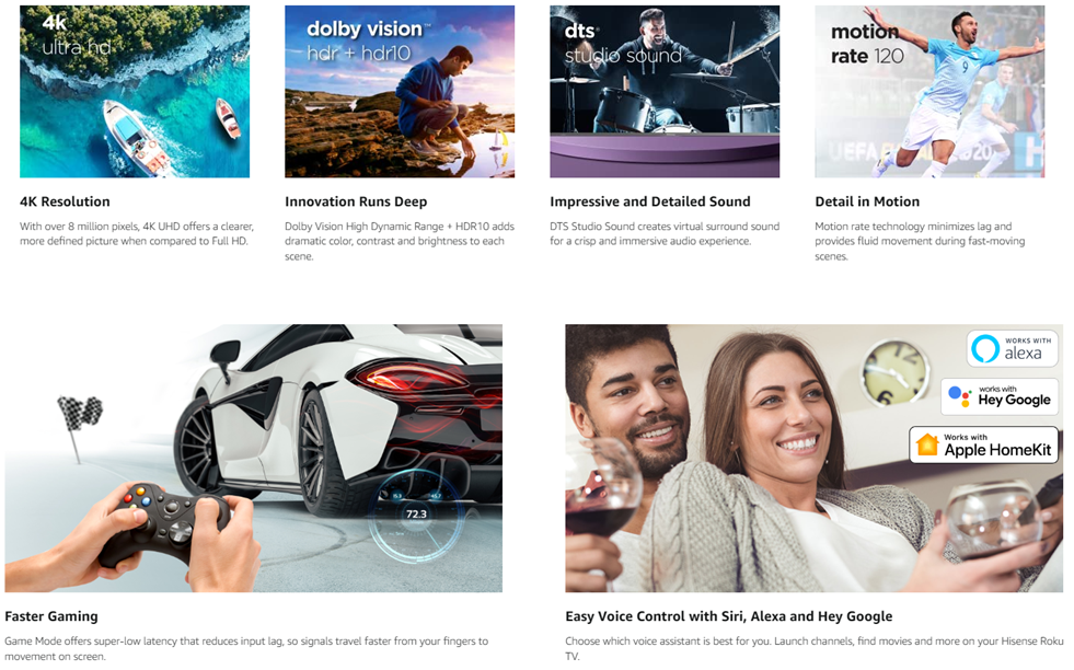 The Hisense Roku TV R6 Series packs incredible details into a 4K Ultra High Definition picture. It features High Dynamic Range (HDR) that boosts color and contrast while Motion Rate 120 technology makes it easier to follow fast action scenes. Plus, with a Roku TV operating system, it's easier to watch what you love with access to thousands of streaming channels, apps, and live TV.