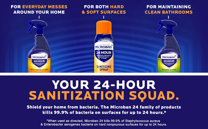 Microban 24 Hour Multi-Purpose Cleaning Spray keeps killing 99.9% of bacteria** for up to 24 Hours, even after multiple touches*, to support a clean and healthy home. This all-purpose sanitizing cleaner is great for every day messes and is suitable for use on all different types of non-food contact hard surfaces, like garbage cans, bathroom sinks, cabinets, etc. Use this multi-purpose spray for an efficient clean. Use around the home and on other high touch areas. This powerful formula penetrates soap scum and greasy soils while reducing odors. Let Microban protect you and your family from harmful germs for a healthy home. *When used as directed **Effective against S. aureus & E. Aerogenes +Effective against bacteria and viruses (Human Coronavirus, Influenza A H1N1, (RSV) Respiratory Syncytial Virus) ++ Effective against Aspergillus niger