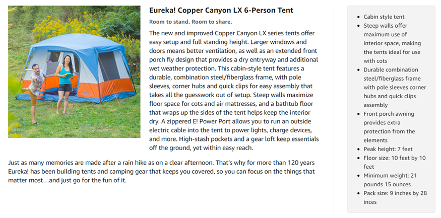 The Copper Canyon LX’s easy setup, smart features, and full standing height make it Eureka’s most livable family car camping tent. Durable, steel and fiberglass frame features pole sleeves corner hubs, and quick clips for easy assembly that takes all the guesswork out of setup. Steep walls create lots of standing room and are ideal when camping with air mattress and cots. There are two massive doors at the front and rear that make it easy for everyone to get in and out. Large mesh windows with waterproof curtains offer scenic views and plenty of ventilation. Extended fly coverage over the door provides extra weather protection and a dry entryway. The zippered E! Powerport lets you easily run an extension cord inside so you can keep everyone’s gadgets charged. Measures 13 feet by 10 feet (floor) and 7 feet tall; packs to 11 by 29 inches; minimum weight of 33 pounds, 8 ounces. Includes: Tent Body, Waterproof Fly with Built-in Guyline Storage, Steel Bottom Poles (6), Fiberglass Top Poles (3), Brim Pole (1), Gear Lofts (2), Tent Bag, Stake Bag, Pole Bag, Stakes (14), Guy Ropes (6), Instructions. Ideal for: car camping, family camping, recreational camping, campground camping, beach camping, backyard camping, kayak and canoe camping, overlanding, adventure camping. Eureka! found its humble beginnings in 1895 and today their camping gear gives you the freedom to have fun - from tents to cooking systems, and sleeping bags to camp furniture - reliable, easy-to-use, and packed with features campers care about.