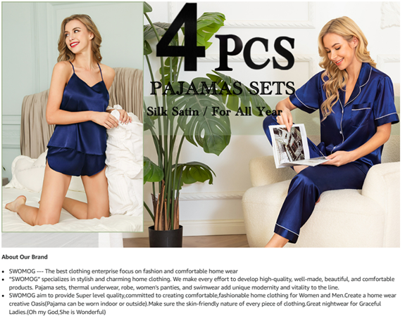 【Premium Material】--- This 4 piece pajama set is made of high-quality satin(95% Polyester, 5% Spandex), which is very soft, lightweight, and comfortable. This lightweight pajama set has a silky texture that will make you feel smooth and shiny, never pilling or fading, and help you sleep well, dreamlike.